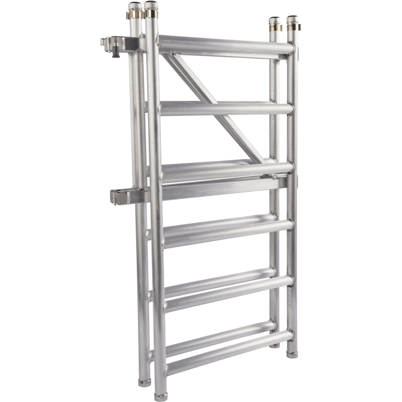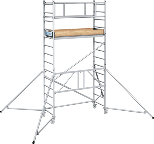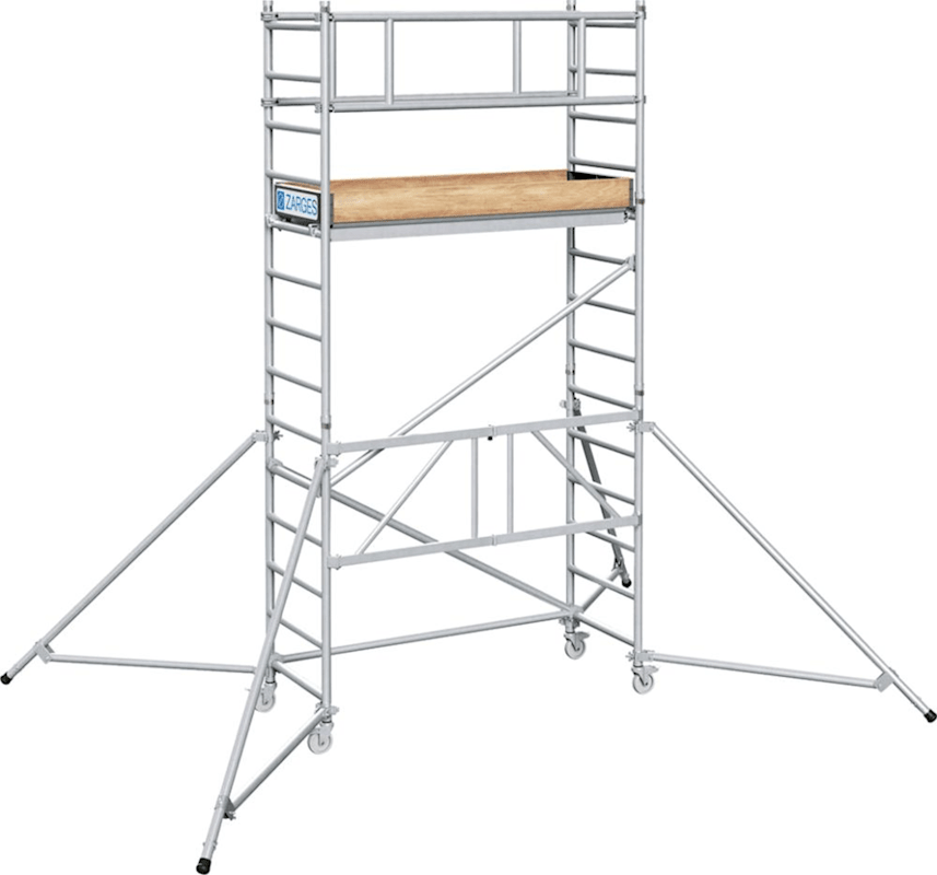 ZARGES PaxTower 1T: -Einfache Einhandbedienung des Klapprahmens mit robustem Arretierknopf: Feststellen und lösen mit nur einem Klick. -Leichtlauf-Aufsteckführung aus Hartkunststoff: Kein Verkanten beim Zusammenführen der Aufsteckrahmen. -Patentierte Bordbrett-Einheit: Schnell platziert, schnell fixiert. -Gerüstlänge: 1,80 m; Gerüstbreite: 0,72 m. -Nach neuer EN 1004; Gerüstklasse 3 (belastbar bis 200kg/m²). -125 mm Lenkrollen mit Feststellbremse; diese sind durch Rollenadapter (Bestell-Nr. 42794) zu spindelbaren Rollen aufrüstbar. -Holm- und Sprossendurchmesser 45 mm.