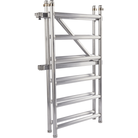 Mit vorlaufenden Geländer nach neuer EN 1004-1. Einfache Einhandbedienung des Klapprahmens mit robustem Arretierknopf: Feststellen und lösen mit nur einem Klick. Patentierte Bordbrett-Einheit: Schnell platziert, schnell fixiert. Leichtlauf-Aufsteckführung aus Hartkunststoff: Kein Verkanten beim Zusammenführen der Aufsteckrahmen.
