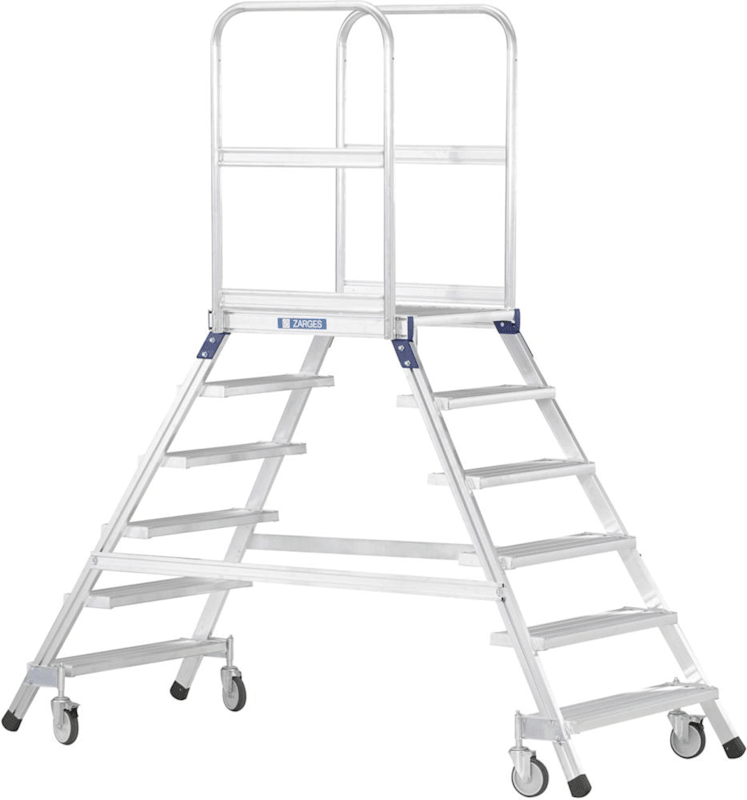 ZARGES Podesttreppe, fahrbar, beidseitig begehbar, mit Leichtmetall-Stufen und Plattform: Maximale Flexibilität bei Auf- und Abstieg, größerer Arbeitsbereich auf den Stufen, und hohe Mobilität sowie sicherer Stand durch vier Federrollen. -Einfache und schnelle Montage aufgrund neuer Verbindungselemente. -Bequemer Aufstieg durch 200 mm tiefe Stufen. -Große Standplattform 600 x 800 mm. -Mobil und schnell einsatzbereit aufgrund von vier Federlenkrollen (davon zwei mit Feststeller). -Maximale Sicherheit durch beidseitiges Plattformgeländer mit 1,00 m Höhe. Entspricht der Norm EN 131-7.