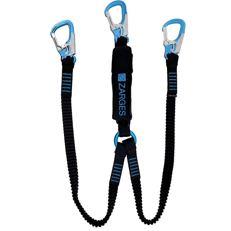 Doppeltes Verbindungsmittel mit elastischen Armen gemäß EN 354:2010 und integriertem Falldämpfer gemäß EN 355:2002. Der integrierte O-Ring verhindert das Verdrehen der Arme während der Anwendung. Die Länge ist fexibel und kann zwischen 1,40 m und 1,80 m variiert werden. Das Verbindungsmittel ist wahlweise mit Karabinern oder Gerüsthaken ausgestattet.