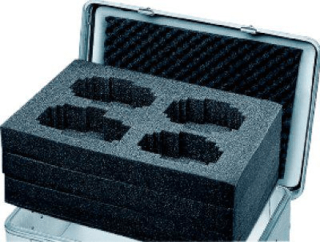 Würfelschaumset. Vorgestanzte Weichschaumeinlagen aus offenzelligem PU-Schaum. Die schnelle und einfache Lösung für Einzelstücke oder Kleinserien. Formanpassung ohne Werkzeug möglich. Zwei unterschiedliche Plattenstärken im Set, Deckeleinsatz Noppenschaum 30 mm, Bodenschaum 10 mm. Noppenschaum für Deckel selbstklebend ausgestattet. Passend zu Baureihen K 424 XC, K 470, Eurobox und ZARGES Box.