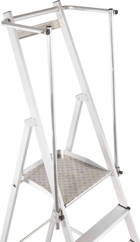 -Aluminium- Arbeitsplattform, ca. 400 x 400 mm, mit dreiseitigem Sicherheitsgeländer (Höhe 1.000 mm).