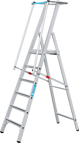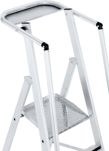 ZARGES ZAP Safemaster S: Die gebördelte Stufen-Plattformleiter kann jetzt nachträglich mit Auslegern ausgestattet werden um der EN 131-7 zu entsprechen. -Aluminium- Arbeitsplattform, ca. 400 x 400 mm, mit dreiseitigem Sicherheitsgeländer (Höhe 1.000 mm). -Eloxierte Handläufe und Geländer. -Großzügige Ablageschale für Werkzeug und Kleinteile. -Optimale Stabilität durch beidseitige, starre Verbindung mit Druckaussteifung. -80 mm tiefe Stufen mit ZARGES Safer Step Technology für ermüdungsfreies Stehen. -Optionale Auslegersätze ermöglichen eine nachträgliche Aufrüstung auf die EN 131, Teil 7.