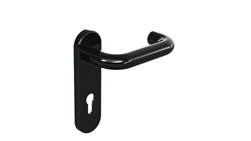 HEWI Drückergarnitur 111R01.210; Produkttyp: Drückergarnitur; Produkttyp (Hersteller): Drückergarnitur; Ausführung: Kurzschild; Befestigungsart: verdeckt verschraubt; Befestigungstechnik: mit Stütznocken; Form: oval; Vierkant: 8 mm; Material: Kunststoff; Material Unterkonstruktion: Kunststoff-Edelstahlverbundbau; Form Türgriff (innen): U-Form; Ausführung Türgriff (innen): mit Stahlkern; Form Türgriff (außen): U-Form; Ausführung Türgriff (außen): mit Stahlkern; Durchmesser Türgriff (innen): 23 mm; Durchmesser Türgriff (außen): 23 mm; Länge Türgriff (innen): 150 mm; Länge Türgriff (außen): 150 mm; Höhe Türgriff (innen): 67 mm; Höhe Türgriff (außen): 67 mm; Schildbreite außen: 46 mm; Schildbreite innen: 46 mm; Schildlänge außen: 168 mm; Schildlänge innen: 168 mm; Schildstärke außen: 11 mm; Schildstärke innen: 11 mm; Lagerung: festdrehbar,wartungsfreies Gleitlager; Einsatzbereich: Zimmertür,Objekttür; Türart: Vollblatt; Türwerkstoff: Stahl,Holz; Norm: DIN 18255,DIN 18040,DIN EN 1906,DIN EN 179; Zulassung: für Fluchttüren; Anwendung: außen/innen; Lochung: Profilzylinder gelocht; Entfernung: 72 mm; DIN-Richtung: DIN Links-Rechts; Farbe: schwarz; Farbton: tiefschwarz; Oberfläche: hochglanz; Technik: R-Technik; Ausführung Vierkant: Vierkantstift; Türstärke min.: 38,1 mm; Türstärke max.: 48 mm