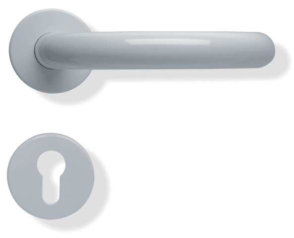 HEWI Drückergarnitur 111R01.530; Produkttyp: Drückergarnitur; Produkttyp (Hersteller): Drückergarnitur; Ausführung: Rosette; Befestigungsart Drückerrosette (außen): verdeckt verschraubt; Befestigungsart Drückerrosette (innen): verdeckt verschraubt; Befestigungstechnik: mit Stütznocken; Montageart: aufliegend; Form Drückerrosette: rund; Form Schlüsselrosette (außen): rund; Form Schlüsselrosette (innen): rund; Vierkant: 8 mm; Material: Kunststoff; Material Türdrücker: Kunststoff; Material Rosetteneinleger: Kunststoff; Material Unterkonstruktion (Griffrosette): Kunststoff-Edelstahlverbundbau; Form Türgriff (innen): gebogen; Ausführung Türgriff (innen): mit Stahlkern; Form Türgriff (außen): gebogen; Ausführung Türgriff (außen): mit Stahlkern; Durchmesser Türgriff (innen): 23 mm; Durchmesser Türgriff (außen): 23 mm; Durchmesser Schlüsselrosette: 55 mm; Länge Türgriff (innen): 149 mm; Länge Türgriff (außen): 149 mm; Höhe Türgriff (innen): 98 mm; Höhe Türgriff (außen): 98 mm; Durchmesser Drückerrosette (außen): 55 mm; Durchmesser Drückerrosette (innen): 55 mm; Höhe Drückerrosette (außen): 10,5 mm; Höhe Drückerrosette (innen): 10,5 mm; Höhe Schlüsselrosette (außen): 10,5 mm; Höhe Schlüsselrosette (innen): 10,5 mm; Lagerung: Doppellager,festdrehbar; Einsatzbereich: Objekttür,Zimmertür; Türart: Vollblatt; Türwerkstoff: Stahl,Holz; Lochung: Profilzylinder gelocht; DIN-Richtung: DIN Links-Rechts; Material Rosette: Kunststoff; Farbe: grau; Farbton: felsgrau; Oberfläche: hochglanz; Oberfläche Türdrücker: beschichtet; Oberfläche Rosette: beschichtet; Oberfläche Rosetteneinleger: beschichtet; Material Unterkonstruktion (Schlüsselrosette): Kunststoff-Edelstahlverbundbau; Technik: R-Technik; Ausführung Vierkant: Vierkantstift; Türstärke min.: 38,1 mm; Türstärke max.: 48 mm; Norm: DIN EN 179,DIN 18040,DIN 18255,DIN EN 1906; Zulassung: für Fluchttüren