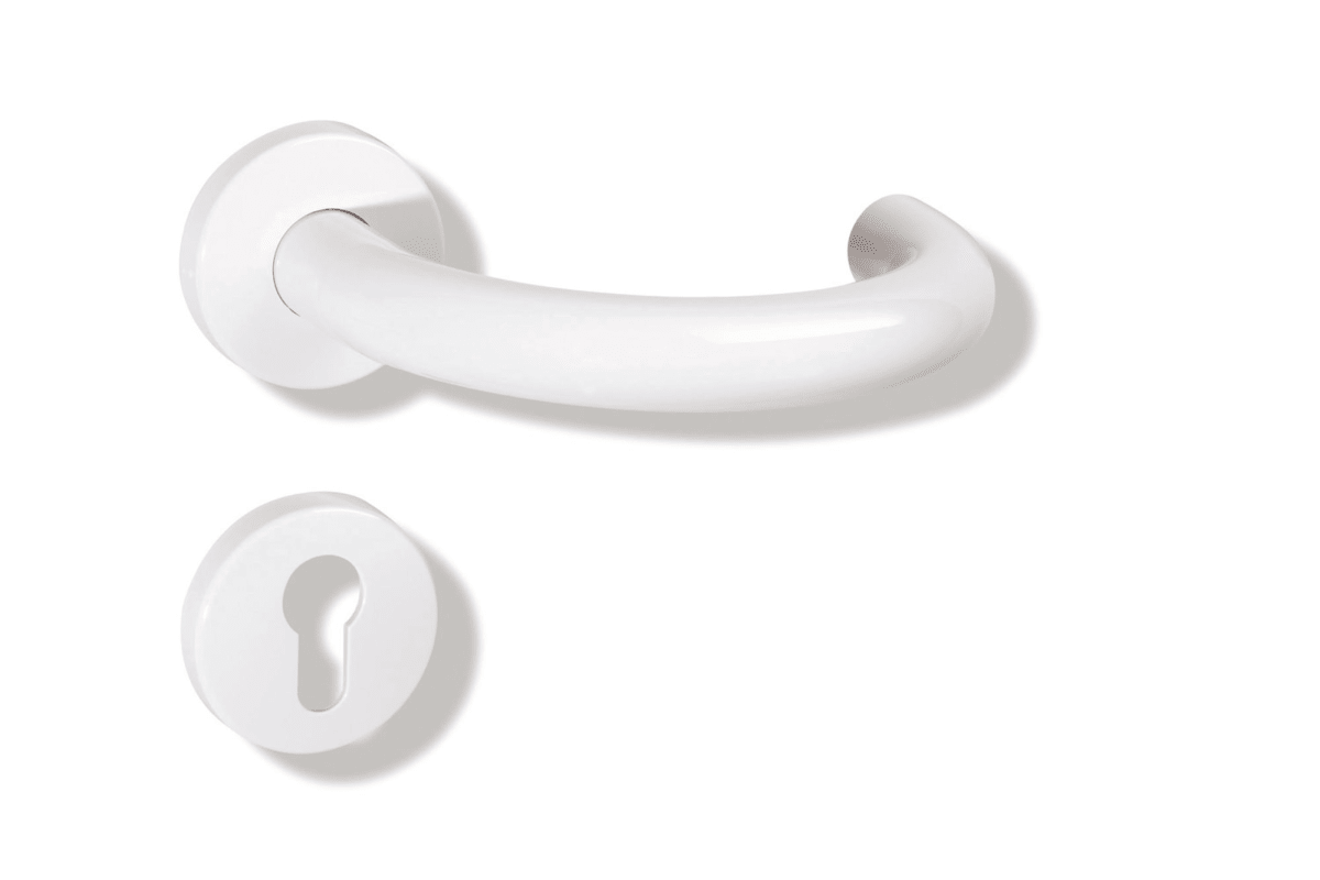 HEWI Drückergarnitur 111R01.530; Produkttyp: Drückergarnitur; Produkttyp (Hersteller): Drückergarnitur; Ausführung: Rosette; Befestigungsart Drückerrosette (außen): verdeckt verschraubt; Befestigungsart Drückerrosette (innen): verdeckt verschraubt; Befestigungstechnik: mit Stütznocken; Montageart: aufliegend; Form Drückerrosette: rund; Form Schlüsselrosette (außen): rund; Form Schlüsselrosette (innen): rund; Vierkant: 8 mm; Material: Kunststoff; Material Türdrücker: Kunststoff; Material Rosetteneinleger: Kunststoff; Material Unterkonstruktion (Griffrosette): Kunststoff-Edelstahlverbundbau; Form Türgriff (innen): gebogen; Ausführung Türgriff (innen): mit Stahlkern; Form Türgriff (außen): gebogen; Ausführung Türgriff (außen): mit Stahlkern; Durchmesser Türgriff (innen): 23 mm; Durchmesser Türgriff (außen): 23 mm; Durchmesser Schlüsselrosette: 55 mm; Länge Türgriff (innen): 149 mm; Länge Türgriff (außen): 149 mm; Höhe Türgriff (innen): 98 mm; Höhe Türgriff (außen): 98 mm; Durchmesser Drückerrosette (außen): 55 mm; Durchmesser Drückerrosette (innen): 55 mm; Höhe Drückerrosette (außen): 10,5 mm; Höhe Drückerrosette (innen): 10,5 mm; Höhe Schlüsselrosette (außen): 10,5 mm; Höhe Schlüsselrosette (innen): 10,5 mm; Lagerung: Doppellager,festdrehbar; Einsatzbereich: Objekttür,Zimmertür; Türart: Vollblatt; Türwerkstoff: Stahl,Holz; Lochung: Buntbart gelocht; DIN-Richtung: DIN Links-Rechts; Material Rosette: Kunststoff; Farbe: weiß; Farbton: reinweiß; Oberfläche: hochglanz; Oberfläche Türdrücker: beschichtet; Oberfläche Rosette: beschichtet; Oberfläche Rosetteneinleger: beschichtet; Material Unterkonstruktion (Schlüsselrosette): Kunststoff-Edelstahlverbundbau; Technik: R-Technik; Ausführung Vierkant: Vierkantstift; Türstärke min.: 38,1 mm; Türstärke max.: 48 mm; Norm: DIN EN 179,DIN 18040,DIN 18255,DIN EN 1906; Zulassung: für Fluchttüren