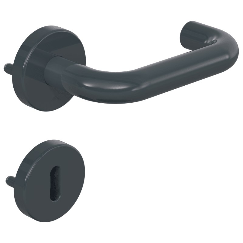 HEWI Drückergarnitur 111R01.130; Produkttyp: Drückergarnitur; Produkttyp (Hersteller): Drückergarnitur; Ausführung: Rosette; Befestigungsart Drückerrosette (außen): verdeckt verschraubt; Befestigungsart Drückerrosette (innen): verdeckt verschraubt; Befestigungstechnik: mit Stütznocken; Montageart: aufliegend; Form Drückerrosette: rund; Form Schlüsselrosette (außen): rund; Form Schlüsselrosette (innen): rund; Vierkant: 8 mm; Material: Kunststoff; Material Türdrücker: Kunststoff; Material Rosetteneinleger: Kunststoff; Material Unterkonstruktion (Griffrosette): Kunststoff-Edelstahlverbundbau; Form Türgriff (innen): U-Form; Ausführung Türgriff (innen): mit Stahlkern; Form Türgriff (außen): U-Form; Ausführung Türgriff (außen): mit Stahlkern; Durchmesser Türgriff (innen): 20 mm; Durchmesser Türgriff (außen): 20 mm; Durchmesser Schlüsselrosette: 55 mm; Länge Türgriff (innen): 138 mm; Länge Türgriff (außen): 138 mm; Höhe Türgriff (innen): 65,5 mm; Höhe Türgriff (außen): 65,5 mm; Durchmesser Drückerrosette (außen): 55 mm; Durchmesser Drückerrosette (innen): 55 mm; Höhe Drückerrosette (außen): 10,5 mm; Höhe Drückerrosette (innen): 10,5 mm; Höhe Schlüsselrosette (außen): 10,5 mm; Höhe Schlüsselrosette (innen): 10,5 mm; Lagerung: festdrehbar,Doppellager; Einsatzbereich: Haustür,Zimmertür,Objekttür; Türart: Vollblatt; Türwerkstoff: Stahl,Holz; Lochung: Buntbart gelocht; DIN-Richtung: DIN Links-Rechts; Material Rosette: Kunststoff; Farbe: grau; Farbton: anthrazitgrau; Oberfläche: hochglanz; Oberfläche Türdrücker: beschichtet; Oberfläche Rosette: beschichtet; Oberfläche Rosetteneinleger: beschichtet; Material Unterkonstruktion (Schlüsselrosette): Kunststoff-Edelstahlverbundbau; Technik: R-Technik; Ausführung Vierkant: Vierkantstift; Türstärke min.: 38,1 mm; Türstärke max.: 48 mm; Norm: DIN EN 179,DIN 18040,DIN 18255,DIN EN 1906; Zulassung: für Fluchttüren