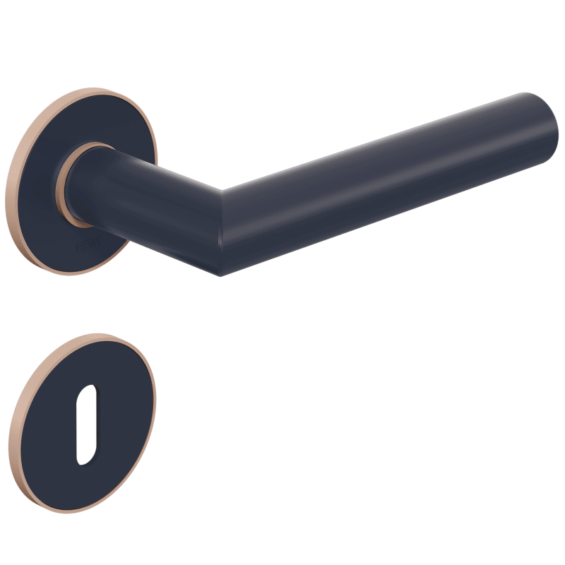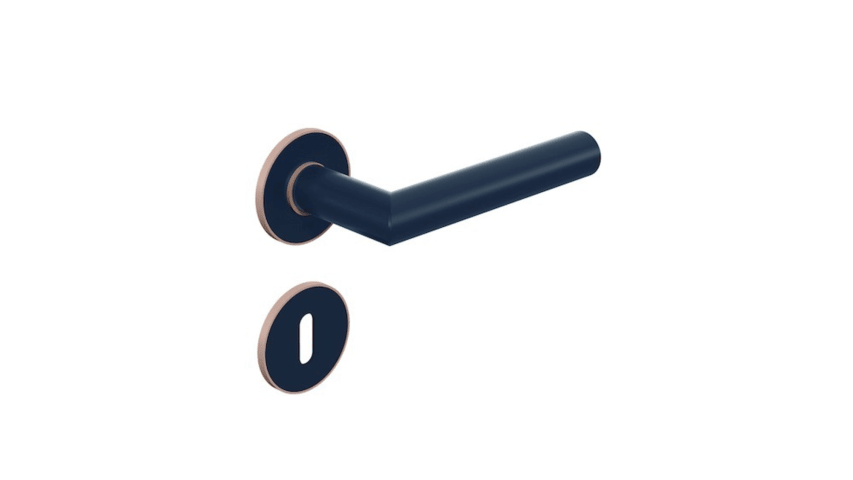 Zimmergarnitur mit Schlüsselrosetten mit flachen Rosetten nach DIN 18255 und DIN EN 1906 und Inlay aus farbigem, mattem Polyamid, bestehend aus: Türdrücker Modell 162.21PB in Gehrungsform aus mattem