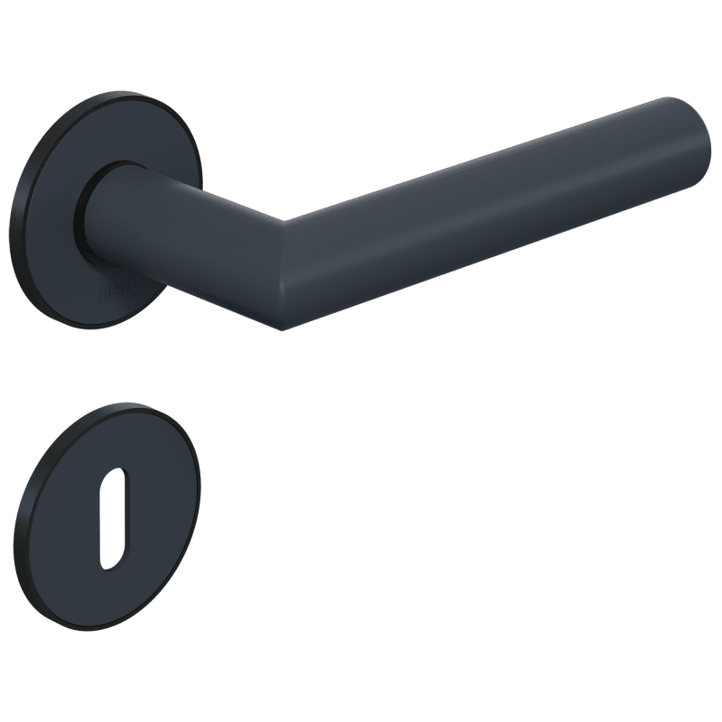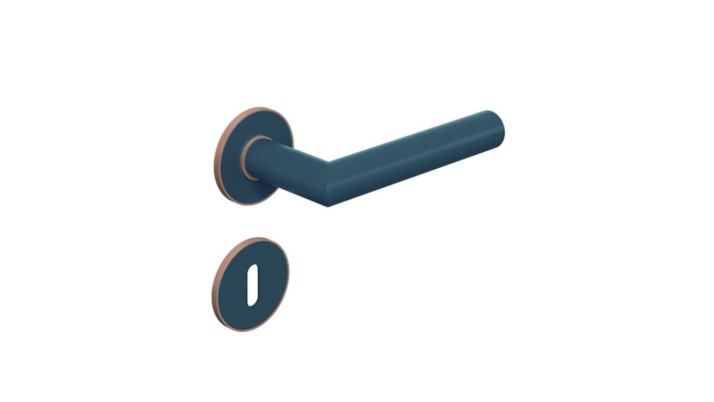 Zimmergarnitur mit Schlüsselrosetten mit flachen Rosetten nach DIN 18255 und DIN EN 1906 und Inlay aus farbigem, mattem Polyamid, bestehend aus: Türdrücker Modell 162.21PB in Gehrungsform aus mattem