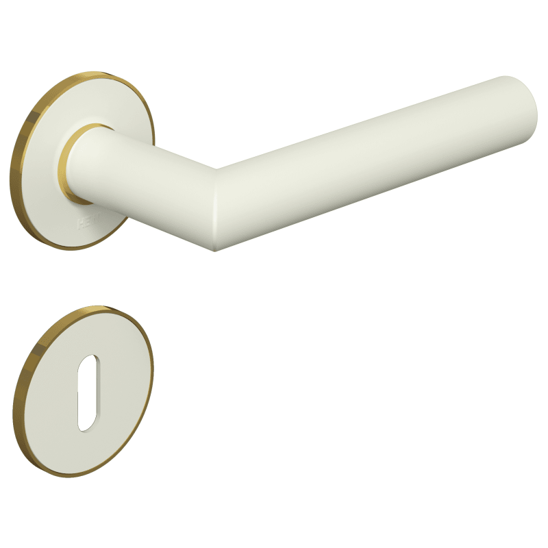 Zimmergarnitur mit Schlüsselrosetten mit flachen Rosetten nach DIN 18255 und DIN EN 1906 und Inlay aus farbigem, mattem Polyamid, bestehend aus: Türdrücker Modell 162.21PB in Gehrungsform aus mattem