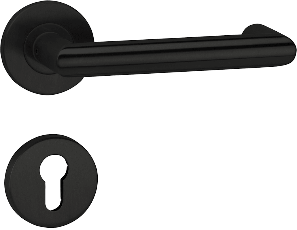 HERMAT Drückergarnitur BASIC 08 1808/2073 M; Produkttyp: Drückergarnitur; Produkttyp (Hersteller): Drückergarnitur; Ausführung: Rosette; Befestigungsart Drückerrosette (außen): verdeckt verschraubt; Befestigungsart Drückerrosette (innen): verdeckt verschraubt; Befestigungsart Schlüsselrosette (außen): verdeckt verschraubt; Befestigungsart Schlüsselrosette (innen): verdeckt verschraubt; Befestigungstechnik: mit Stütznocken; Montageart: aufliegend; Form Drückerrosette: rund; Form Schlüsselrosette (außen): rund; Form Schlüsselrosette (innen): rund; Vierkant: 8 mm; Material: Edelstahl; Material Türdrücker: Edelstahl; Material Unterkonstruktion (Griffrosette): Metall; Form Türgriff (innen): Gehrung,U-Form; Ausführung Türgriff (innen): drehbar; Ausführung Türgriff (außen): drehbar; Durchmesser Schlüsselrosette: 55 mm; Länge Türgriff (innen): 142 mm; Länge Türgriff (außen): 142 mm; Höhe Türgriff (innen): 57 mm; Höhe Türgriff (außen): 57 mm; Durchmesser Drückerrosette (außen): 55 mm; Durchmesser Drückerrosette (innen): 55 mm; Höhe Drückerrosette (außen): 8,2 mm; Höhe Drückerrosette (innen): 8,2 mm; Höhe Schlüsselrosette (außen): 8,2 mm; Höhe Schlüsselrosette (innen): 8,2 mm; Lagerung: festdrehbar,mit Rückholfeder; Einsatzbereich: Zimmertür; Türart: Vollblatt; Türwerkstoff: Holz,Stahl; Lochung: Profilzylinder gelocht; DIN-Richtung: DIN Links-Rechts; Farbe: schwarz; Farbton: classic black; Oberfläche: matt; Material Unterkonstruktion (Schlüsselrosette): Metall; Ausführung Vierkant: Vierkantstift; Türstärke min.: 37 mm; Türstärke max.: 48 mm; Norm: DIN EN 1906