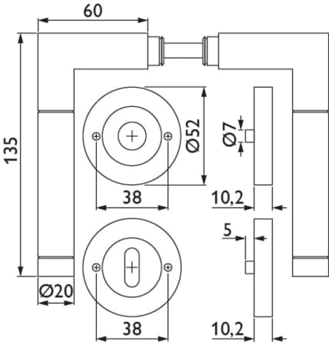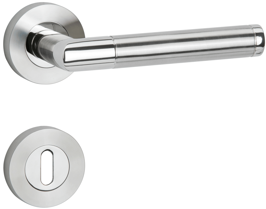 ZT-Drückergarnitur 1114 ER SPACE, mit Schraubrosette 2061, Ausf.: BB, fest/drehbar, mit Rückholfeder, Tst. 38 - 45 mm, Oberfl. 63 (Edelstahl poliert/Edelstahl matt)