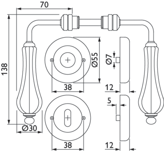 ZT-Drückergarnitur 1048 LADY, mit Schraubrosetten 2060, Ausf.: BB, mit Rückholfeder, Oberfl. 06AP (Eisenf. Antik schwarz/Porz. weiß)