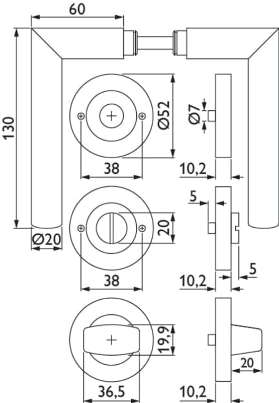 Bad-Drückergarnitur 1231 MOON, mit Schraubrosette 2061, Ausf.: BAD mit WC-Riegel 3221/3216, fest/drehbar, mit Rückholfeder, Tst. 38 - 45 mm, Oberfl. 60 (Edelstahl matt)