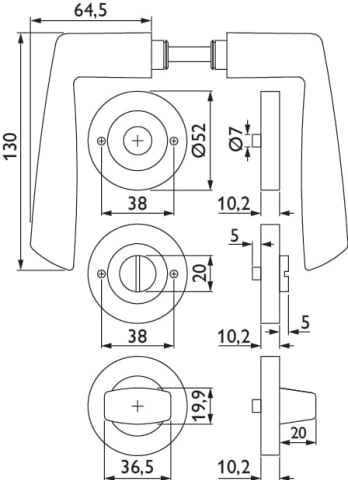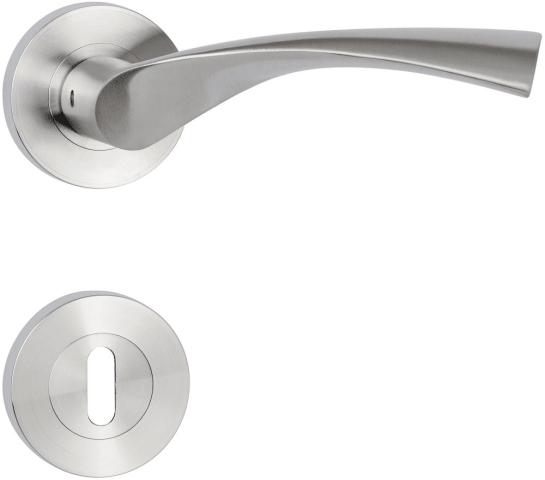 Bad-Drückergarnitur 1290 TWIST, mit Schraubrosette 2061, Ausf.: BAD mit WC-Riegel 3221/3216, fest/drehbar, mit Rückholfeder, Tst. 38 - 45 mm, Oberfl. 60 (Edelstahl matt)
