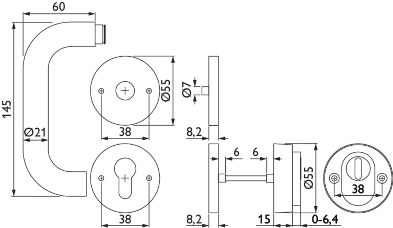 ZT-Drückerlochteil 1801 / 21 mm Ø BASIC 01, festdrehbar auf Rosette 2073 M, beidseitig verwendbar / inkl. Stift 8/10 x 80 mm, mit Rückholfeder und 1 Paar Schutzrosette 2038 KS, Oberfl. 60 (Edelstahl m