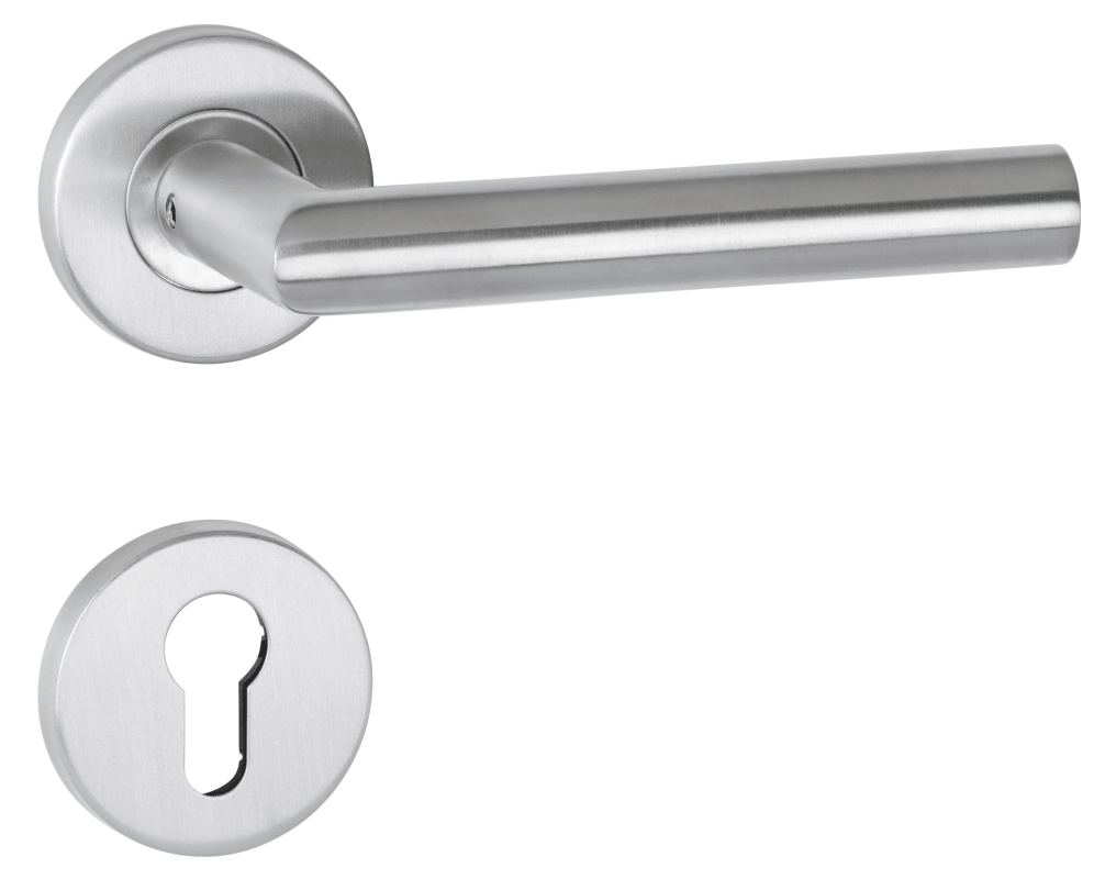 ZT-Drückerlochteil 1802 / 21 mm Ø BASIC 02, festdrehbar auf Rosette 2073 MI, beidseitig verwendbar / 8 mm Vierkant, mit Rückholfeder und 1 Stück PZ Rosette, Oberfl. 60 (Edelstahl matt)