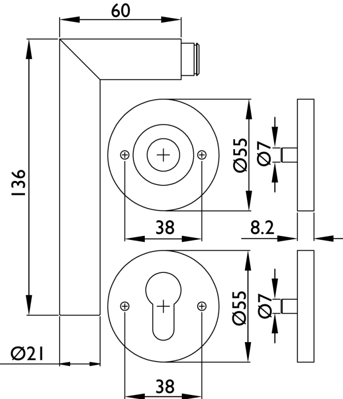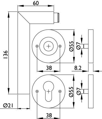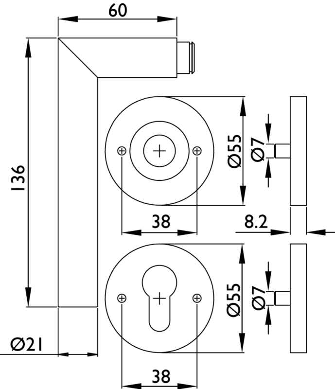 ZT-Drückerlochteil 1802 / 21 mm Ø BASIC 02, festdr. auf Rosette 2073 MI /o. Schrauben o. Stift, beidseitig verwendbar / 8 mm Vierkant, mit Rückholfeder, 1 St. PZ Rosette mit M5 UK, Oberfl. 72 (smoke b