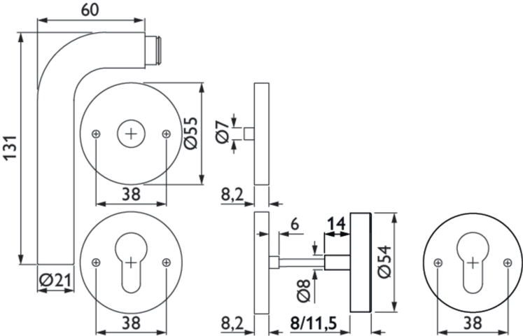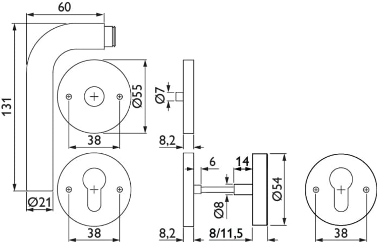 ZT-Drückerlochteil 1803 / 21 mm Ø BASIC 03, fest/drehbar auf Rosette 2073 M, beidseitig verwendbar / inkl. Stift 8/10 x 80 mm, mit Rückholfeder und 1 Paar Schutzrosette 2073 S, Oberfl. 60 (Edelstahl m