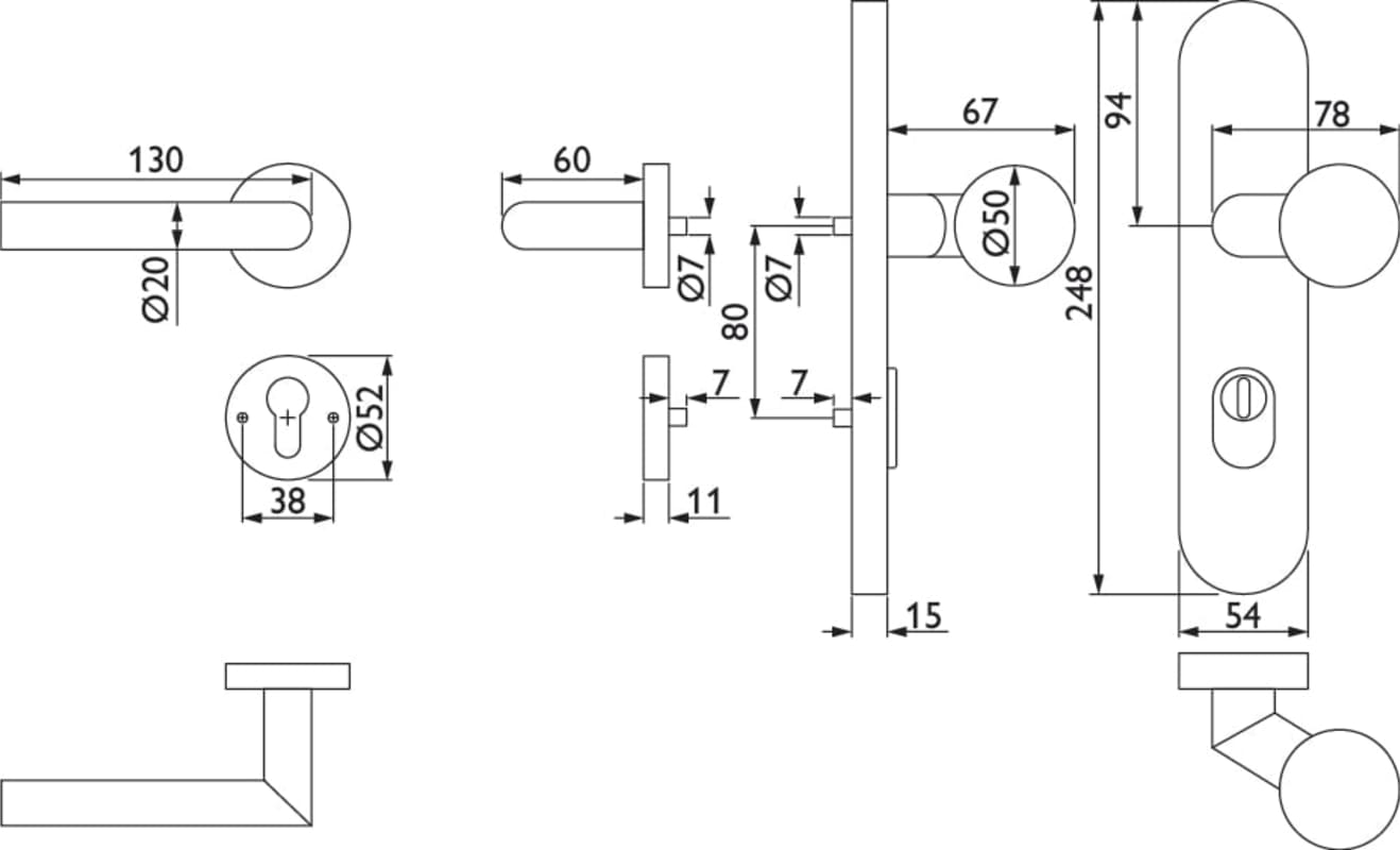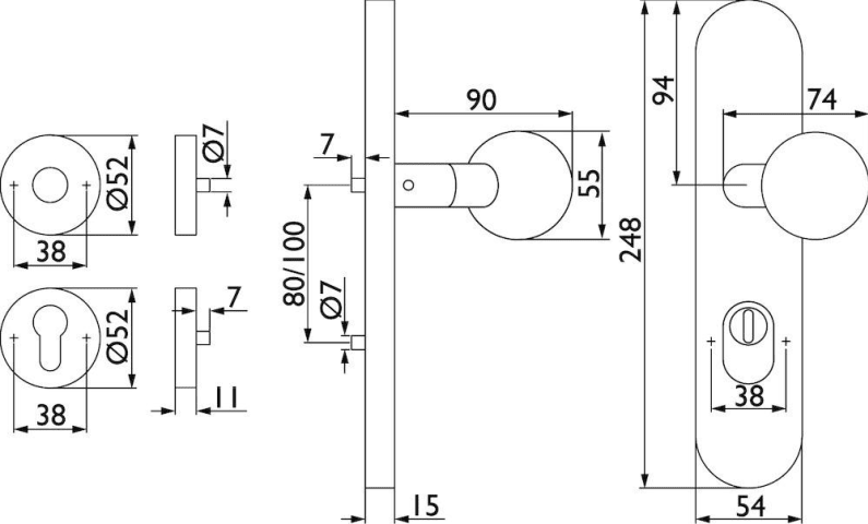ZT-EN2-Kombi-Schutz-Wechselgarnitur 1802 BASIC 02, außen Langschild 2089 KS, Knopf 3126 gekröpft, innen Rosette 2336 SC, PZW 72 rechts, Tst. 36-53mm, mit Kernziehschutz für Zylinderüberstand 8 - 15 mm