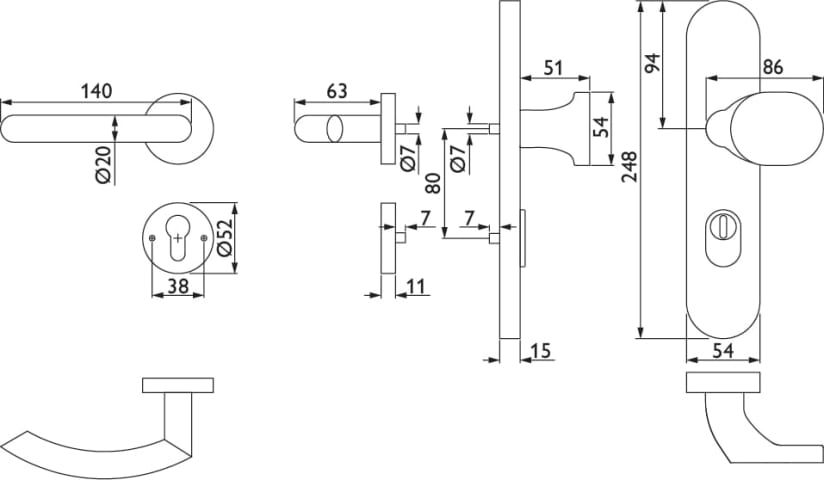 ZT-EN2-Kombi-Schutz-Wechselgarnitur 1804 BASIC 04, außen Langschild 2089 KS, Knopf 3128 gekröpft, innen Rosette 2336 SC, PZW 72 mm, Tst. 36 - 53 mm, mit Kernziehschutz für Zylinderüberstand 8 - 15 mm,