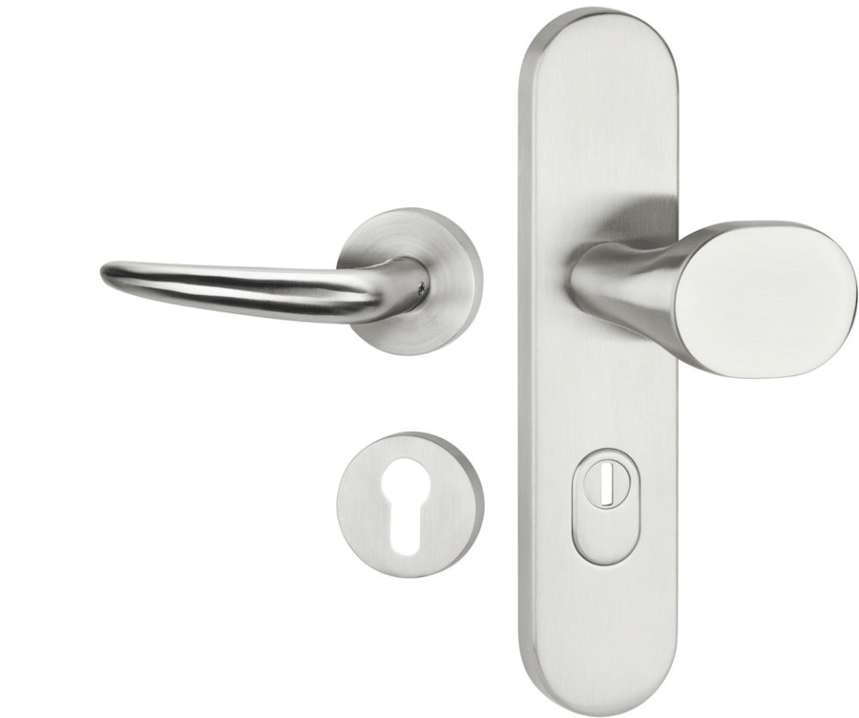 ZT-EN2-Kombi-Schutz-Wechselgarnitur 1806 BASIC 06, außen Langschild 2091 KS, Knopf 3128 gekröpft, innen Rosette 2336 SC, PZW 72 mm, Tst. 37 - 56 mm, mit Kernziehschutz für Zylinderüberstand 9 - 14 mm,