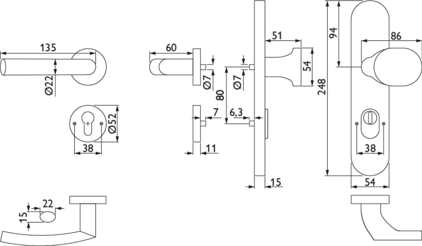 ZT-EN2-Kombi-Schutz-Wechselgarnitur 1807 BASIC 07, außen Langschild 2091 KS, Knopf 3128 gekröpft, innen Rosette 2336 SC, PZW 72 mm, Tst. 37 - 56 mm, mit Kernziehschutz für Zylinderüberstand 9 - 14 mm,