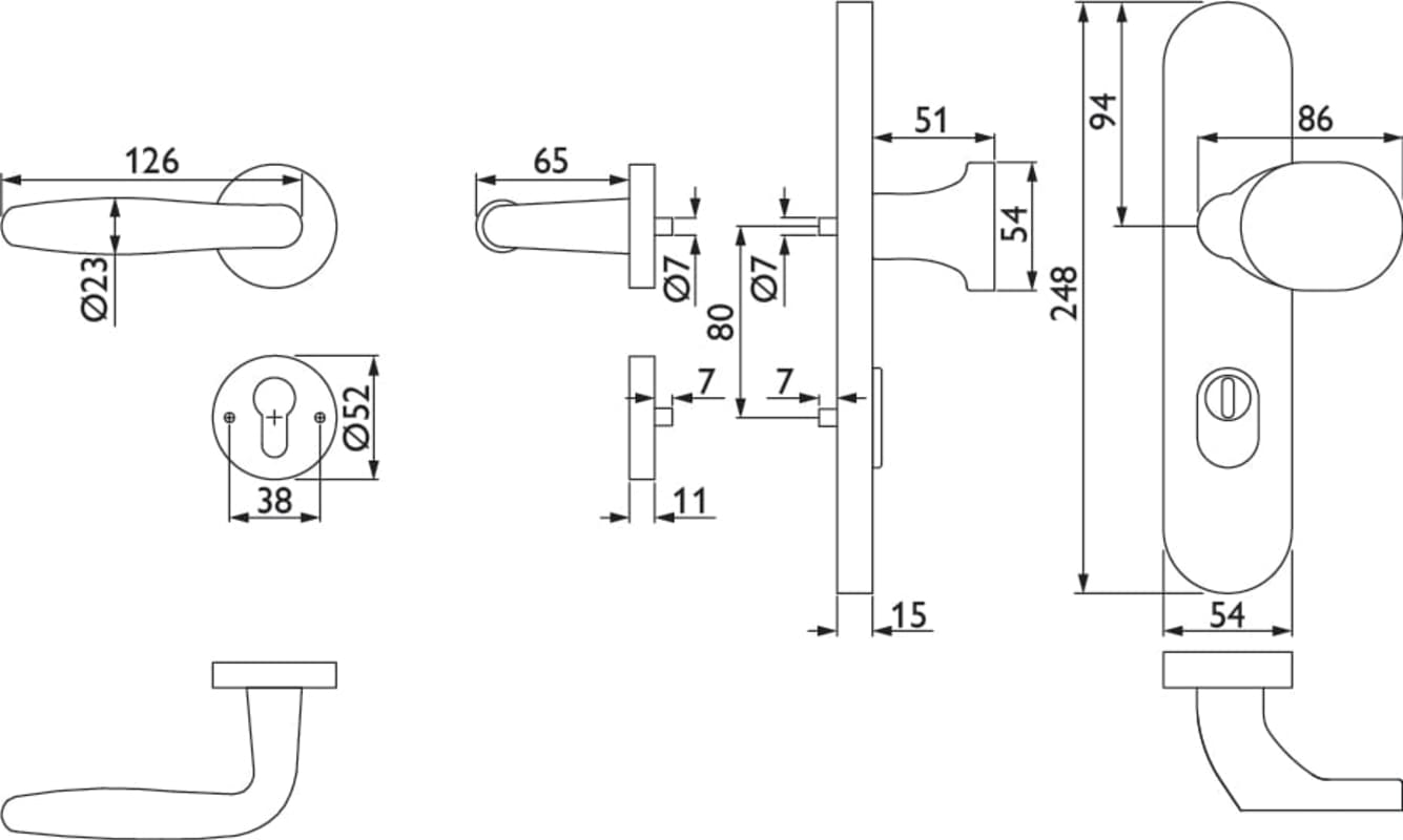 ZT-EN2-Kombi-Schutz-Wechselgarnitur 1931 DREAM, außen Langschild 2089 KS, Knopf 3128 gekröpft, innen Rosette 2336 SC, PZW 72 mm, Tst. 36 - 53 mm, mit Kernziehschutz für Zylinderüberstand 8 - 15 mm, Ob