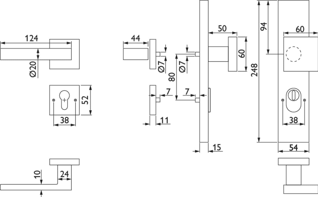 ZT-EN2-Kombi-Schutz-Wechselgarnitur 1682 L WEST, außen Langschild 2094 KS, Knopf 3132 gekröpft, innen Rosette 2311 SC, PZW 72 links, Tst. 36-53 mm, mit Kernziehschutz für Zylinderüberstand 8 - 15 mm,