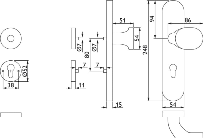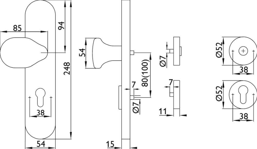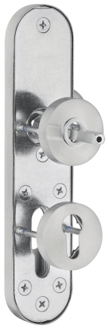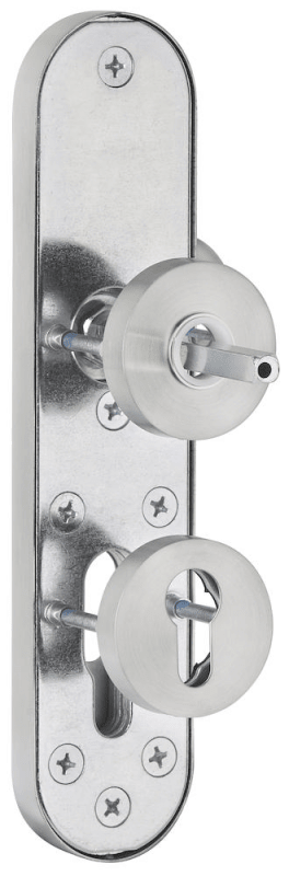 ZT-EN2-Kombi-Schutz-Wechselgarnitur ohne Lochteil, außen Langschild 2089 PZ, Knopf 3128 gekröpft, innen Rosette 2336 SC, PZW 72 mm, Tst. 36 - 53 mm, ohne Kernziehschutz, Oberfl. 60 (Edelstahl matt)