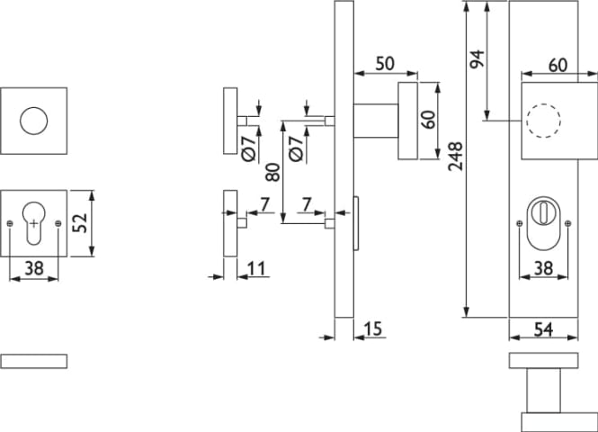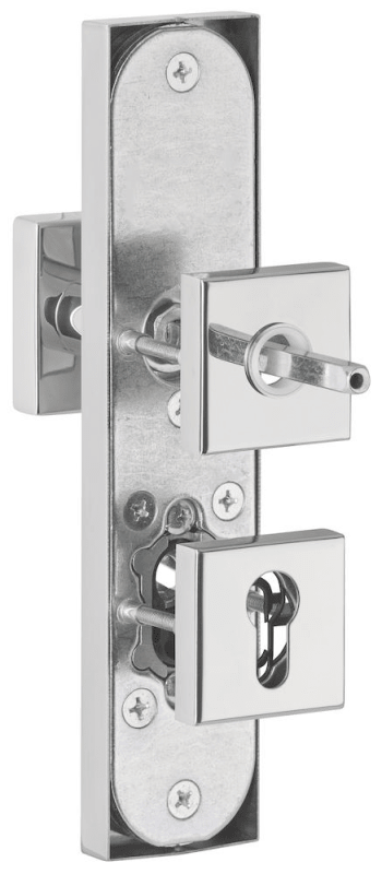 HT-EN2-Kombi-Schutz-Wechselgarnitur ohne Lochteil, außen Langschild 2094 KSH, Knopf 3132 gekröpft, innen Rosette 2311 SC, PZW 92 mm, Tst. 64 - 83 mm, mit Kernziehschutz für Zylinderüberstand 8 - 15 mm