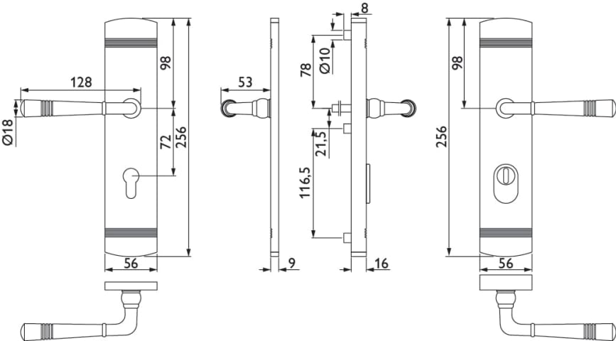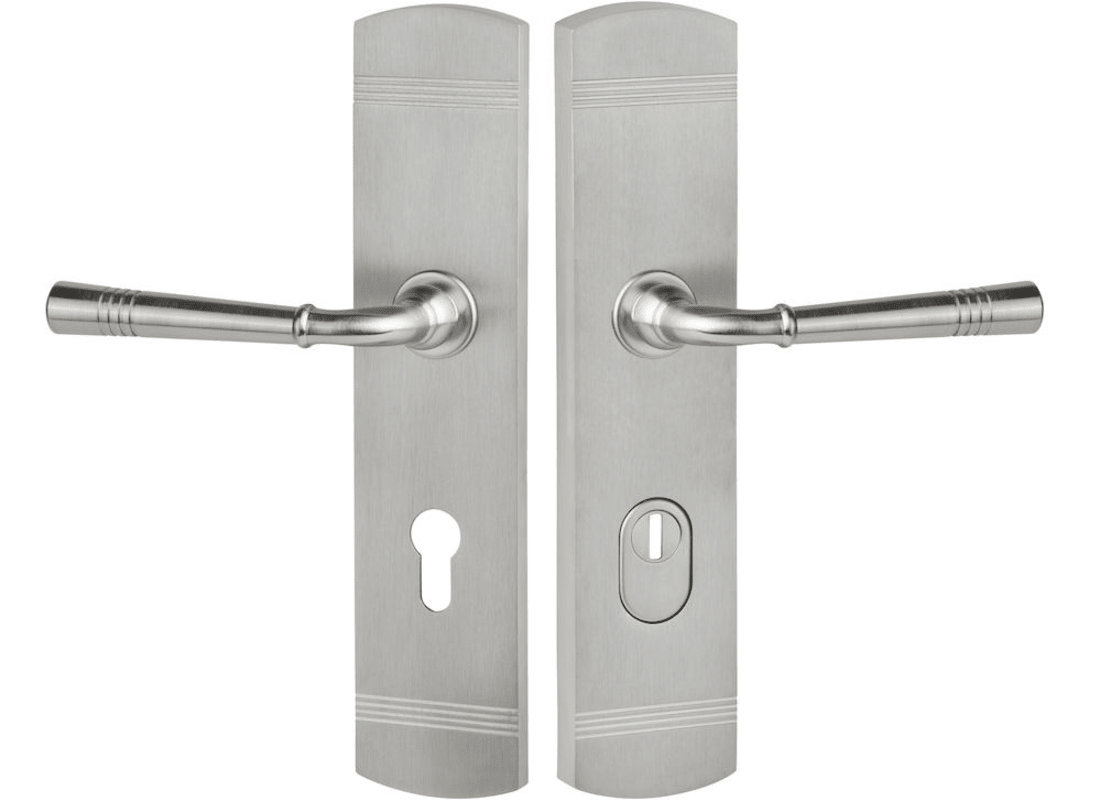 ZT-EN2-Schutz-Drückergarnitur 1174 LYON, mit Langschild 2093 KS, Ausf.: PZ 72 mm, Türstärke 37 - 54 mm, mit Kernziehschutz für Zylinderüberstand 9 - 14 mm, Oberfl. 20 (PVD Edelstahlfarben)