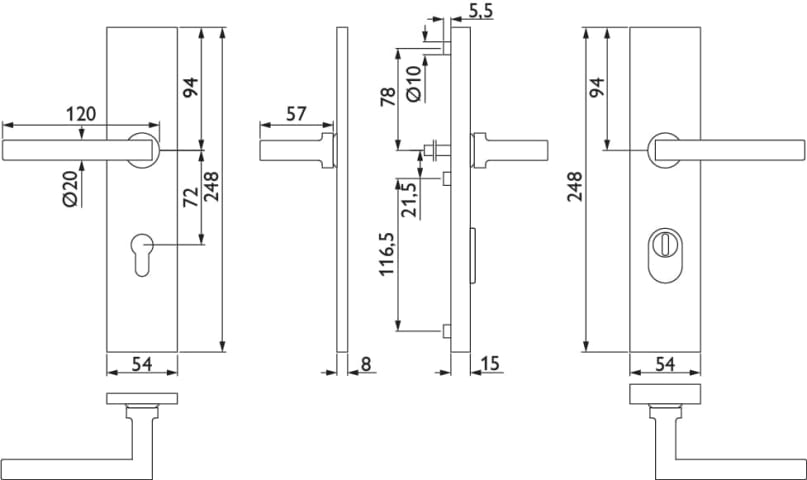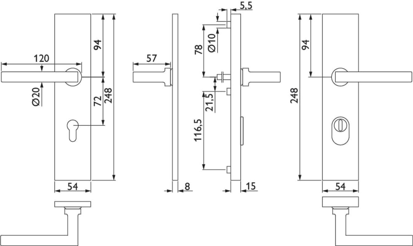 ZT-EN2-Schutz-Drückergarnitur 1835 SQUARE, mit Langschild 2094 KS, Ausf.: PZ 72 mm, Türstärke 36 - 53 mm, mit Kernziehschutz für Zylinderüberstand 8 - 15 mm, Oberfl. 61 (Edelstahl poliert)