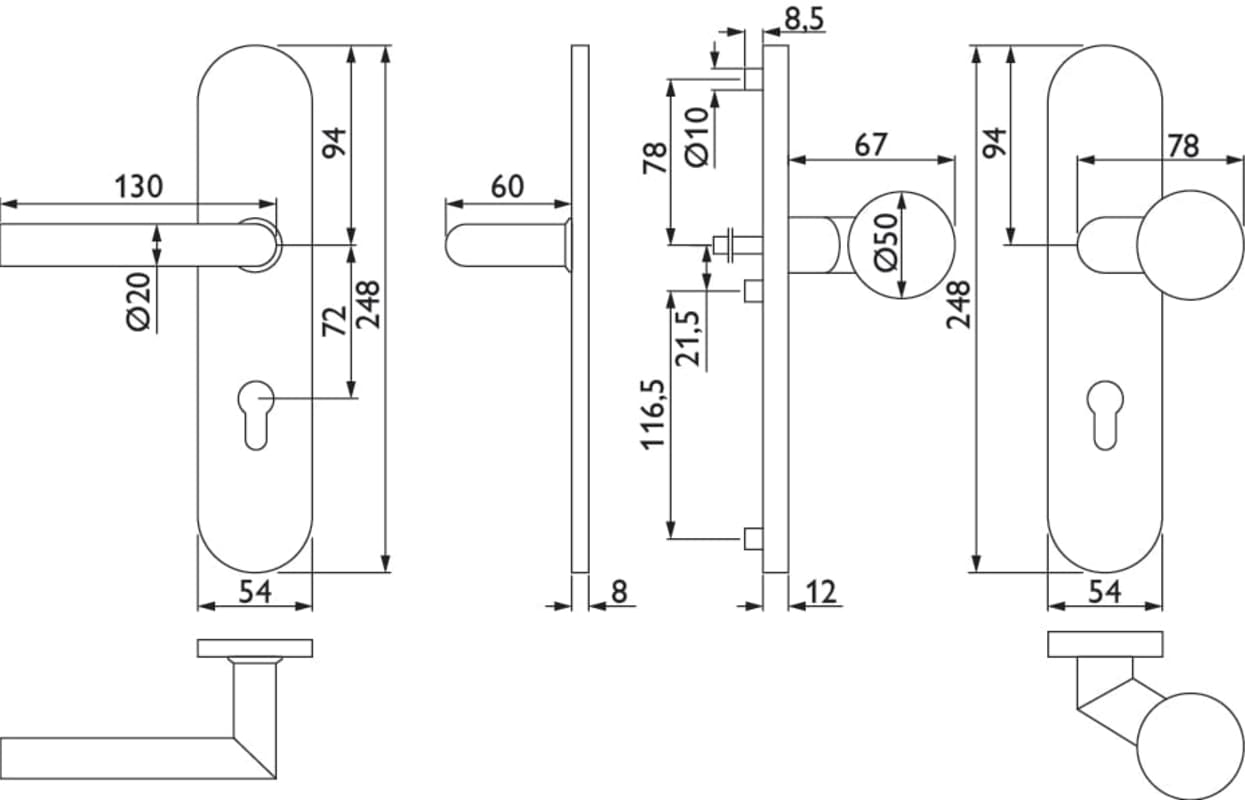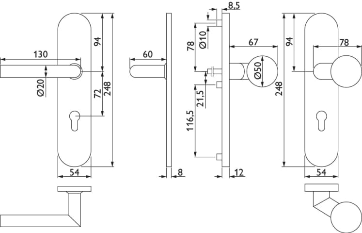 ZT-EN2-Schutz-Wechselgarnitur 1802 BASIC 02, mit Langschild 2089 S, Knopf 3126 gekröpft, Ausf.: PZW 72 mm, Türstärke 36 - 53 mm, mit Anbohrschutz, Außenschildstärke 12 mm, Oberfl. 60 (Edelstahl matt)