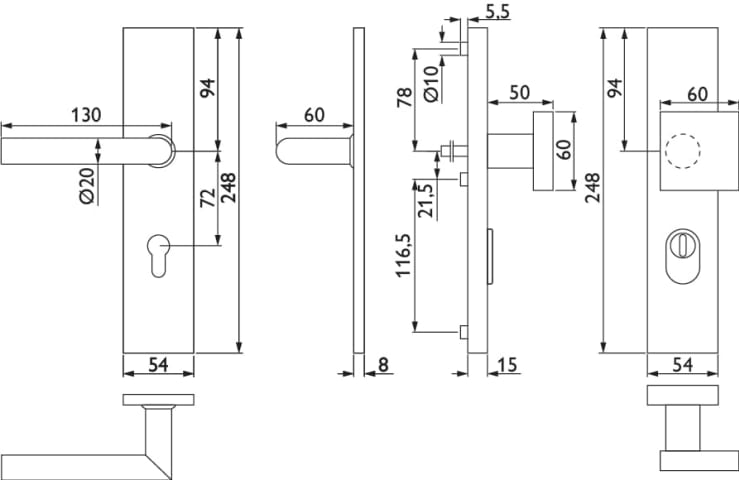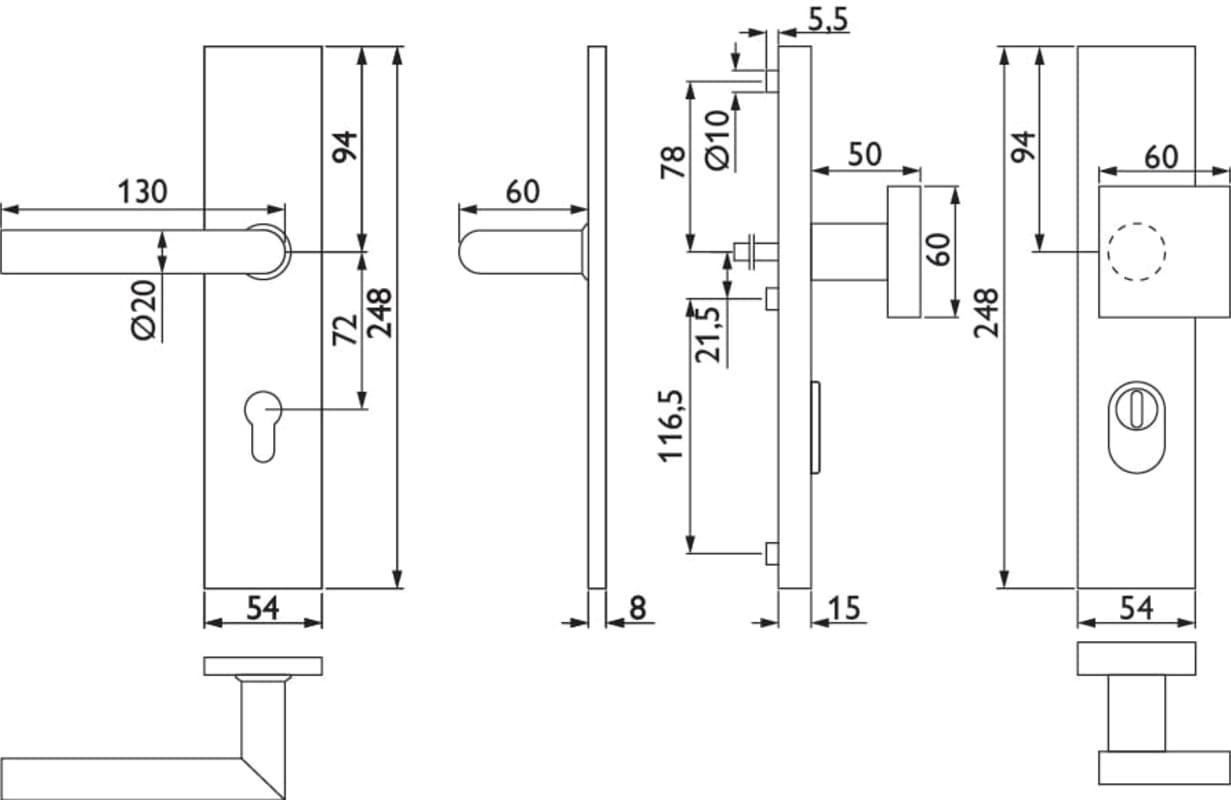 ZT-EN2-Schutz-Wechselgarnitur 1802 BASIC 02, mit Langschild 2094 KS, Knopf 3132 gekröpft, Ausf.: PZW 72 mm, Türstärke 36 - 53 mm, mit Kernziehschutz für Zylinderüberstand 8 - 15 mm, Oberfl. 18 (PVD Me