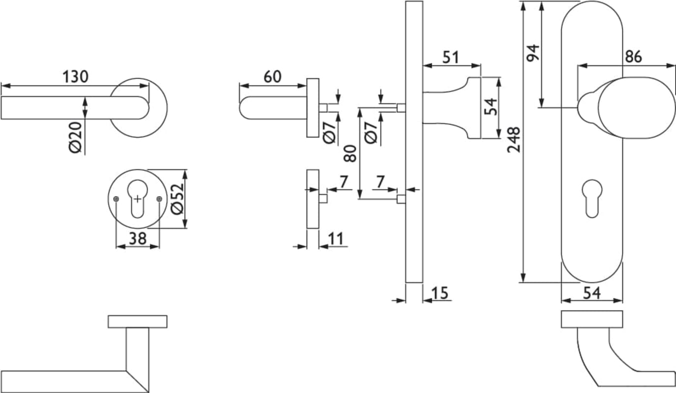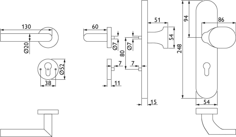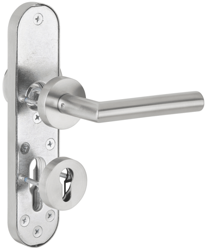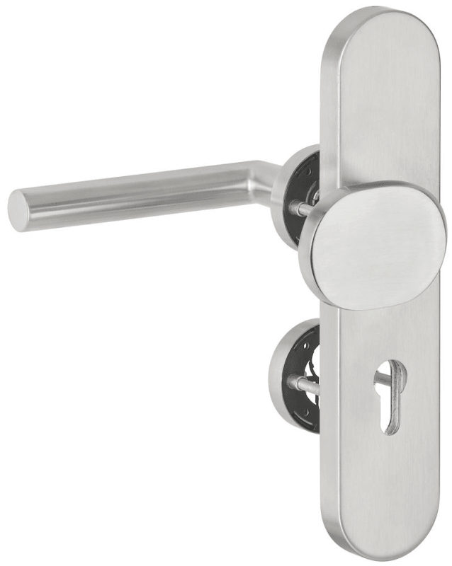 ZT-EN2-Schutz-Wechselgarnitur 1802 BASIC 02, außen Langschild 2089 PZ, Knopf 3128 gekröpft, innen Rosette 2336 SC, PZW 72 mm, Tst. 36 - 53 mm, mit Anbohrschutz, Außenschildstärke 15 mm, Oberfl. 60 (Ed