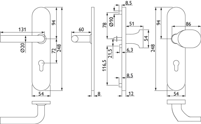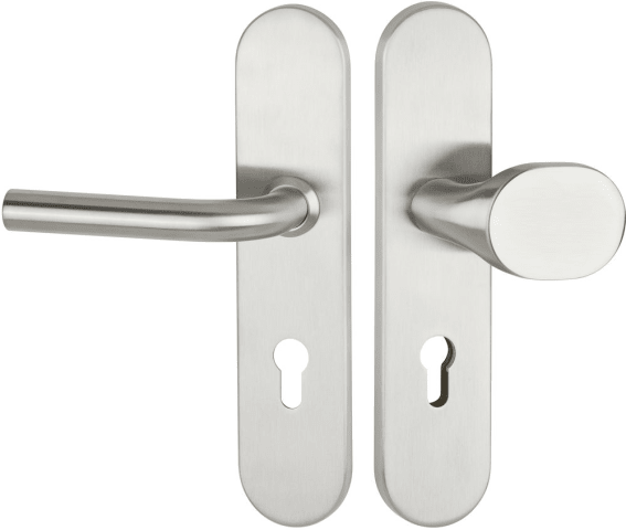 ZT-EN2-Schutz-Wechselgarnitur 1803 BASIC 03, mit Langschild 2091 S, Knopf 3128 gekröpft, Ausf.: PZW 72 mm, Türstärke 35 - 55 mm, mit Anbohrschutz, Außenschildstärke 12 mm, Oberfl. 60 (Edelstahl matt)