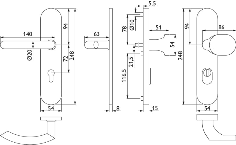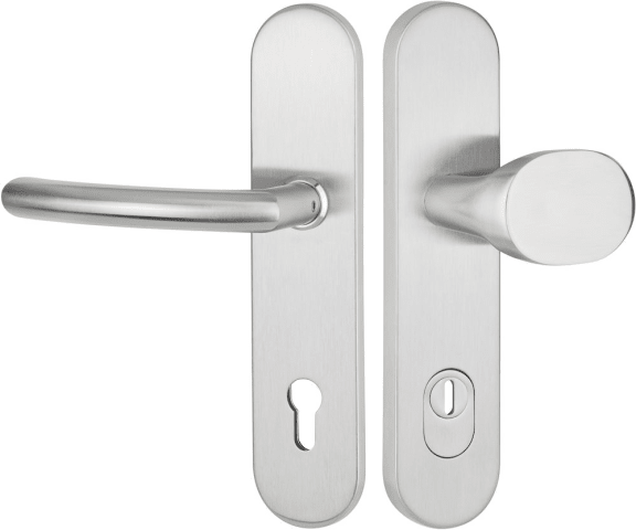 ZT-EN2-Schutz-Wechselgarnitur 1804 BASIC 04, mit Langschild 2089 KS, Knopf 3128 gekröpft, Ausf.: PZW 72 mm, Türstärke 36 - 53 mm, mit Kernziehschutz für Zylinderüberstand 8 - 15 mm, Oberfl. 60 (Edelst