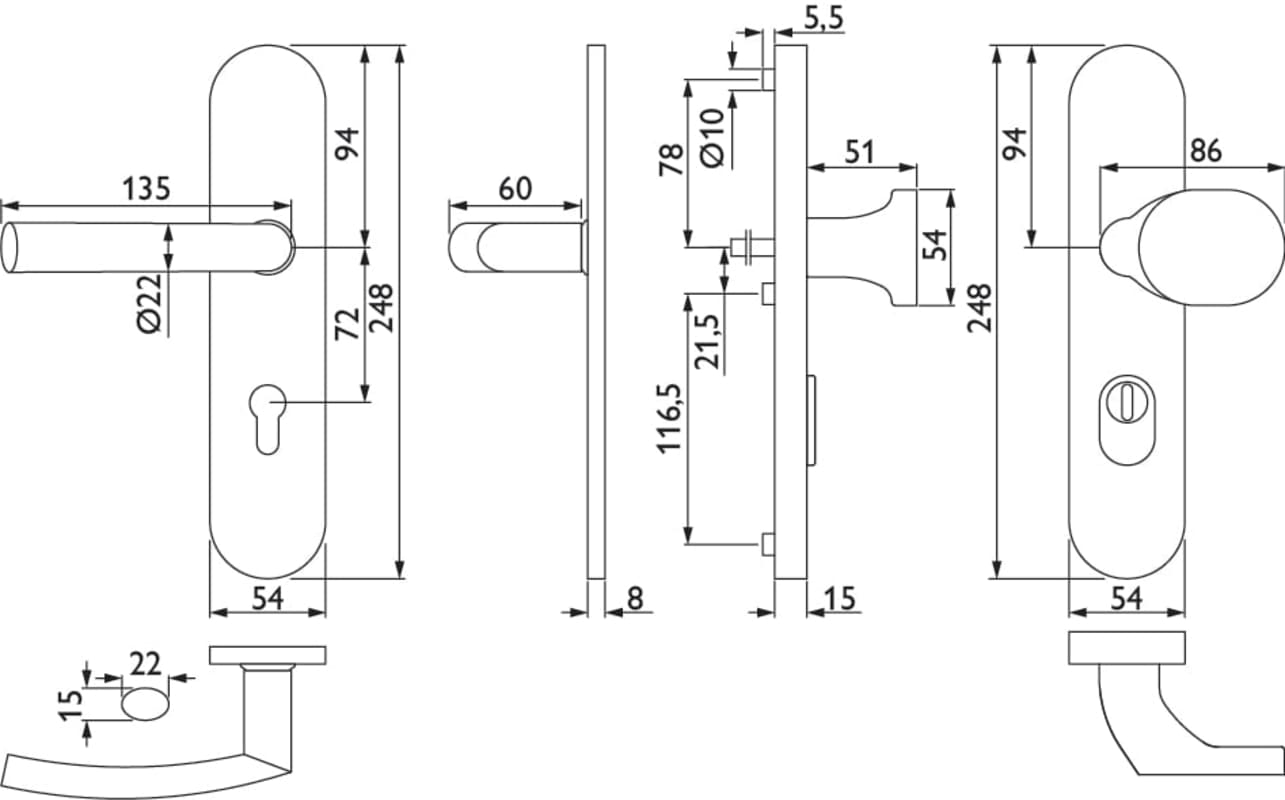 ZT-EN2-Schutz-Wechselgarnitur 1807 BASIC 07, mit Langschild 2089 KS, Knopf 3128 gekröpft, Ausf.: PZW 72 mm, Türstärke 36 - 53 mm, mit Kernziehschutz für Zylinderüberstand 8 - 15 mm, Oberfl. 60 (Edelst