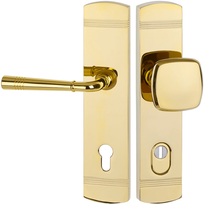 ZT-EN2-Schutz-Wechselgarnitur 1174 LYON, mit Langschild 2093 KS, Knopf 3134, Ausf.: PZW 72 mm, Türstärke 37 - 50 mm, mit Kernziehschutz für Zylinderüberstand 9 - 14 mm, Oberfl. 01 (Messing poliert)