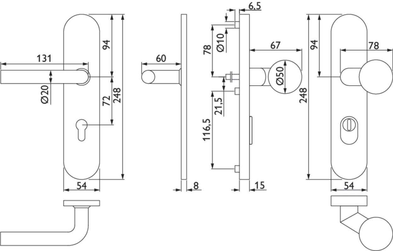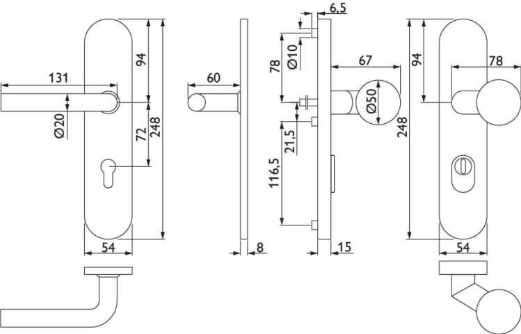 ZT-EN3-Schutz-Wechselgarnitur 1803 BASIC 03, mit Langschild 2089 KS, Knopf 3126 gekröpft, Ausf.: PZW 72 mm, Türstärke 36 - 53 mm, mit Kernziehschutz für Zylinderüberstand 8 - 15 mm, Oberfl. 60 (Edelst