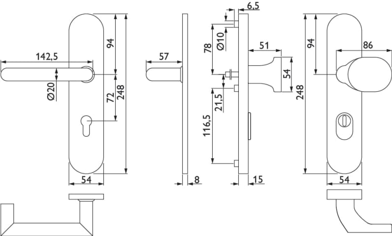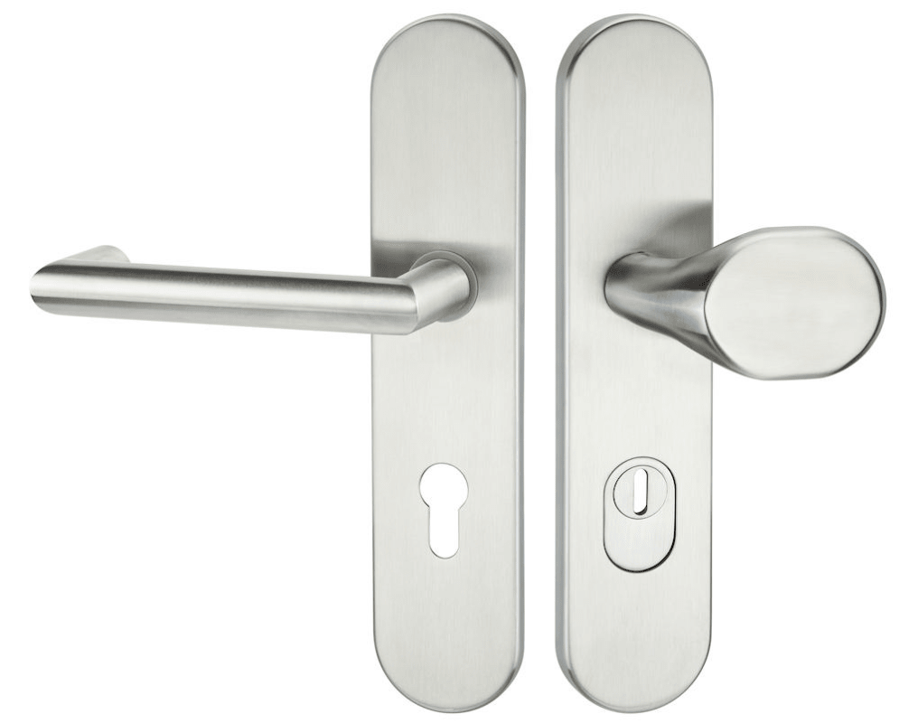 ZT-EN3-Schutz-Wechselgarnitur 1808 BASIC 08, mit Langschild 2089 KS, Knopf 3128 gekröpft, Ausf.: PZW 72 mm, Türstärke 36 - 53 mm, mit Kernziehschutz für Zylinderüberstand 8 - 15 mm, Oberfl. 60 (Edelst