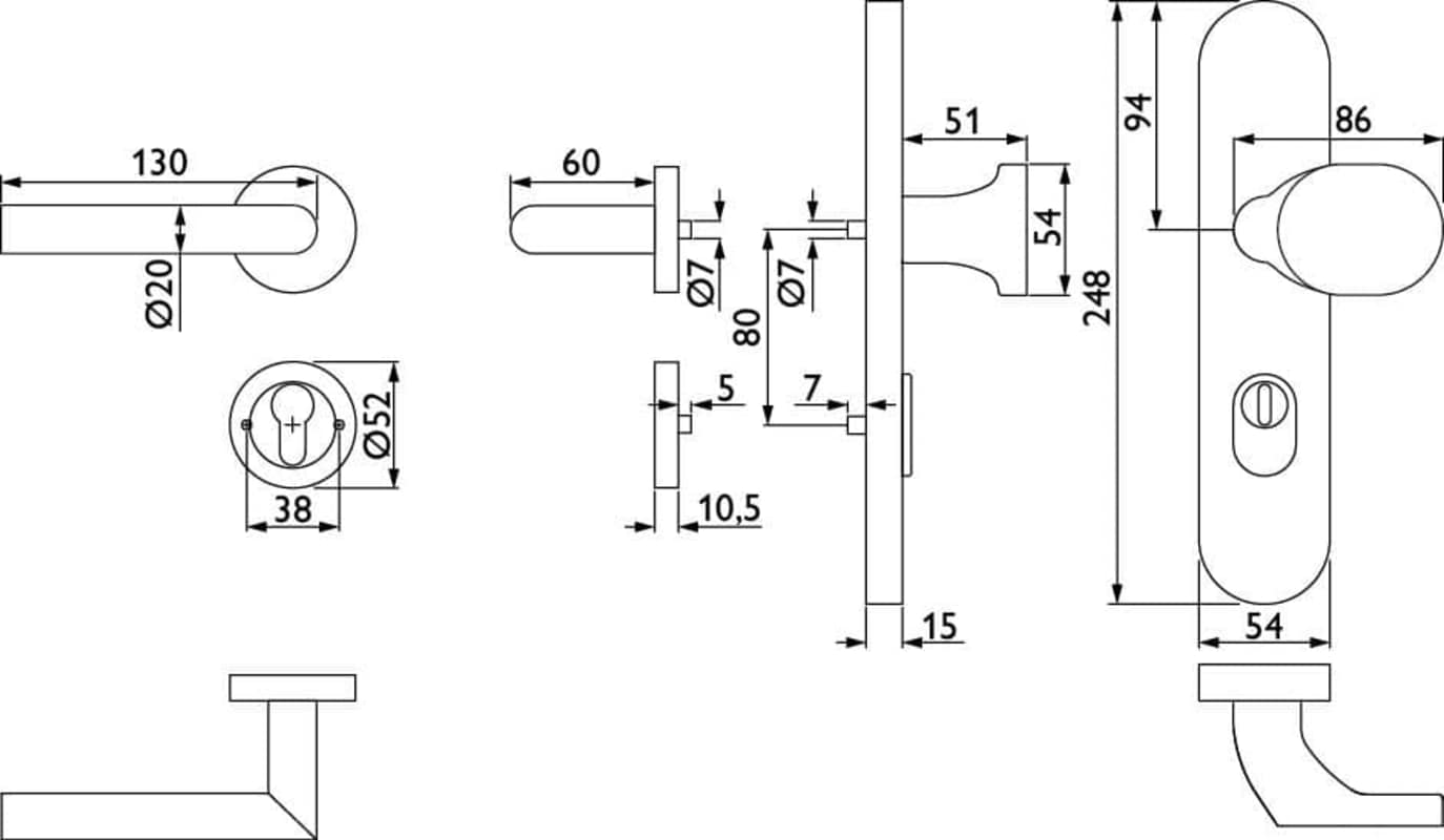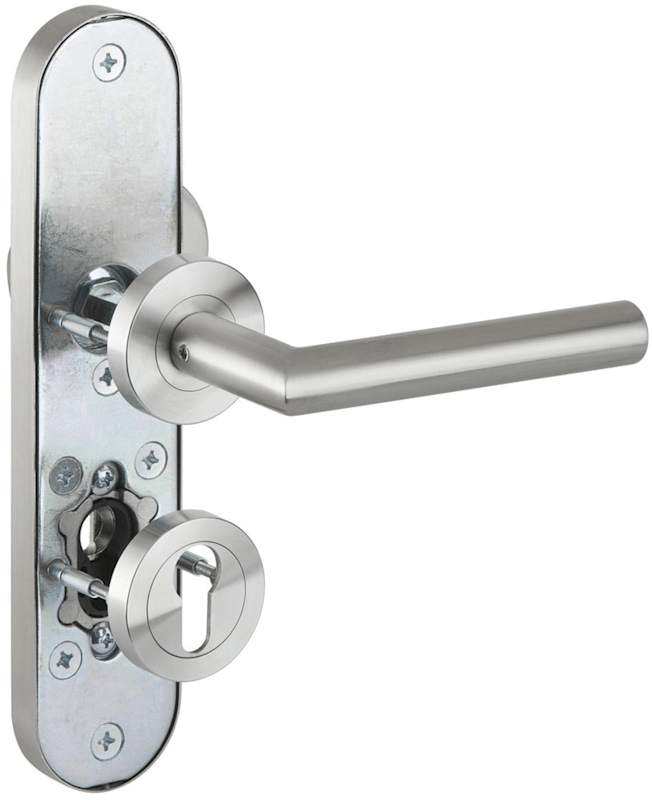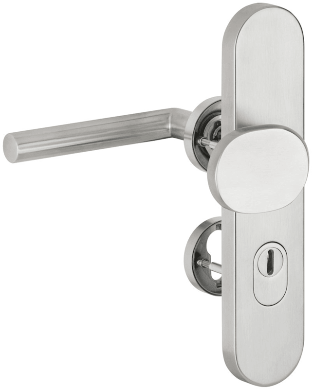 HERMAT Schutz-Kombi-Wechselgarnitur BASIC 02 1802/2089 KS/3128; Produkttyp: Schutz-Kombi-Wechselgarnitur; Produkttyp (Hersteller): Schutz-Kombi-Wechselgarnitur; Ausführung: Langschild/Rosette; Form außen: oval; Form innen: rund; Material: Edelstahl; Form Türgriff (außen): Flachknopf,gekröpft; Ausführung Türgriff (außen): fest; Form Türgriff (innen): Gehrung; Länge Türgriff (außen): 85 mm; Länge Türgriff (innen): 130 mm; Breite Türgriff (außen): 85 mm; Breite Türgriff (innen): 54 mm; Höhe Türgriff (außen): 52 mm; Höhe Türgriff (innen): 60 mm; Durchmesser Türgriff (innen): 20 mm; Durchmesser Rosette: 52 mm; Lagerung: mit Rückholfeder,festdrehbar; Einsatzbereich: Wohnungseingangstür; Türart: Vollblatt; Türwerkstoff: Stahl,Holz; Zylinderabdeckung: mit Zylinderabdeckung; DIN-Richtung: DIN Links; Widerstandsklasse nach DIN 18257: ES 1; Widerstandsklasse nach NEN 5089: SKG**; Vierkant: 8 mm; Entfernung: 72 mm; Lochung: Profilzylinder gelocht; Ausführung Vierkant: Vierkantvollstift; Farbe: grau; Farbton: edelstahl; Oberfläche: matt; Schildlänge: 248 mm; Schildbreite: 54 mm; Schildstärke: 15 mm; Höhe Rosette: 11 mm; Zylinderüberstand min.: 8 mm; Zylinderüberstand max.: 15 mm; Türstärke min.: 36 mm; Türstärke max.: 53 mm; Norm: DIN 18257,DIN EN 1906; EN 1906 - Türmasse: -; EN 1906 - Einbruchschutz: Klasse 2