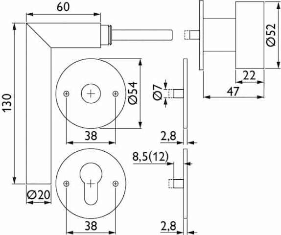 ZT-Wechselgarnitur 1802 BASIC 02, mit MAGCLIP Rosetten 2636 FL & RHF / Knopf 3127, Ausf.: PZW, DIN links, fest/drehbar, mit Rückholfeder, Tst. 37 - 47 mm, Oberfl. 74 (Classic Black, ähnl. RAL 9005)
