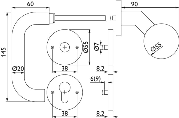 ZT-Wechselgarnitur 1801 BASIC 01 - Klasse 4, mit Rosetten 2073 M / fester Knopf 3126 GK, Ausf.: PZW, DIN links, fest/drehb. m. Rückholf., Metall-UK, Tst. 37-48 mm, Oberfl. 60 (Edelstahl matt)