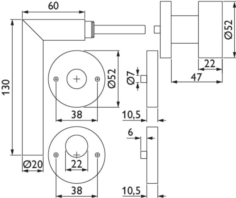 ZT-Wechselgarnitur 1802 BASIC 02, mit Rosetten 2036 K / Knopf 3127, Ausf.: Rundzyl-Loch. Ø=22 mm, links/rechts verw., mit Rückholfeder, Türstärke 38 - 42 mm, Oberfl. 60 (Edelstahl matt)