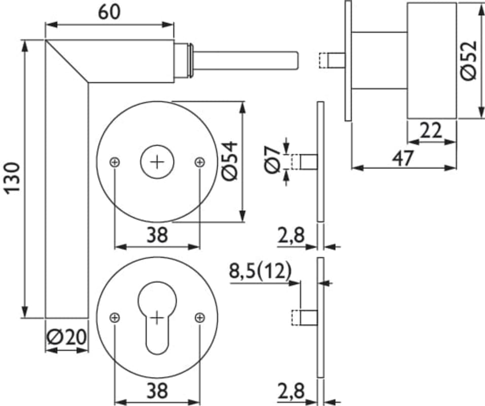 ZT-Wechselgarnitur 1802 BASIC 02, mit MAGCLIP Rosetten 2636 FL & RHF / Knopf 3127, Ausf.: PZW DIN rechts, fest/drehbar, mit Rückholfeder, Tst. 37 - 47 mm, Oberfl. 61 (Edelstahl poliert)