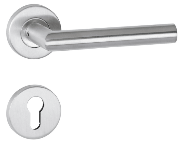 ZT-Wechselgarnitur 1802 BASIC 02 - Klasse 4, mit Rosetten 2073 M / Kugelknopf 3126, Ausf.: PZW, DIN rechts, fest/drehb. m. Rückholf., Metall-UK, Tst. 37-48 mm, Oberfl. 60 (Edelstahl matt)