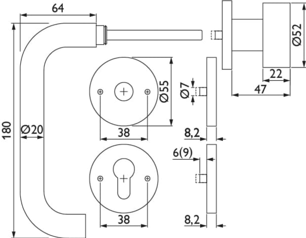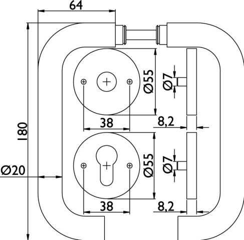 ZT-Wechselgarnitur 1811 BASIC 11 - Klasse 4, mit Rosetten 2073 M / fester Knopf 3127, Ausf.: PZW, DIN rechts, fest/drehb. m. Rückholf., Metall-UK, Tst. 37-48 mm, Oberfl. 60 (Edelstahl matt)