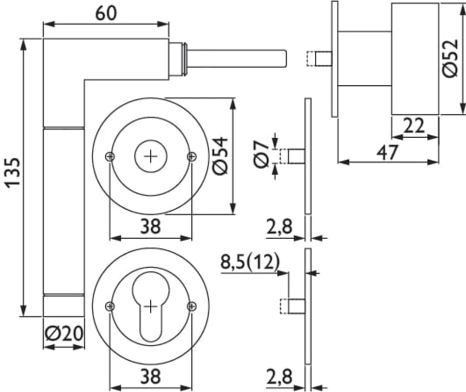 ZT-Wechselgarnitur 1114 ER SPACE ER, mit MAGCLIP Rosetten 2631 FL & RHF / Knopf 3127, Ausf.: PZW DIN links, fest/drehbar, mit Rückholfeder, Tst. 38 - 45 mm, Oberfl. 63 (Edelstahl poliert/Edelstahl mat